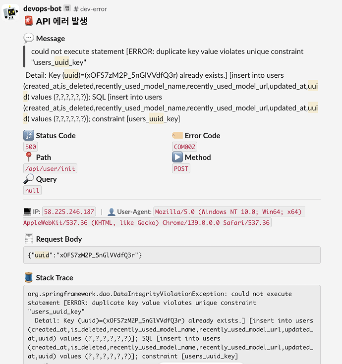 사실 같은 uuid로 동시 요청이 들어오는게 굉장히 엣지 케이스라 예측하지 못했었는데, 막상 개발 서버에 머지하고 나니 다음과 같은 에러가 떴습니다.