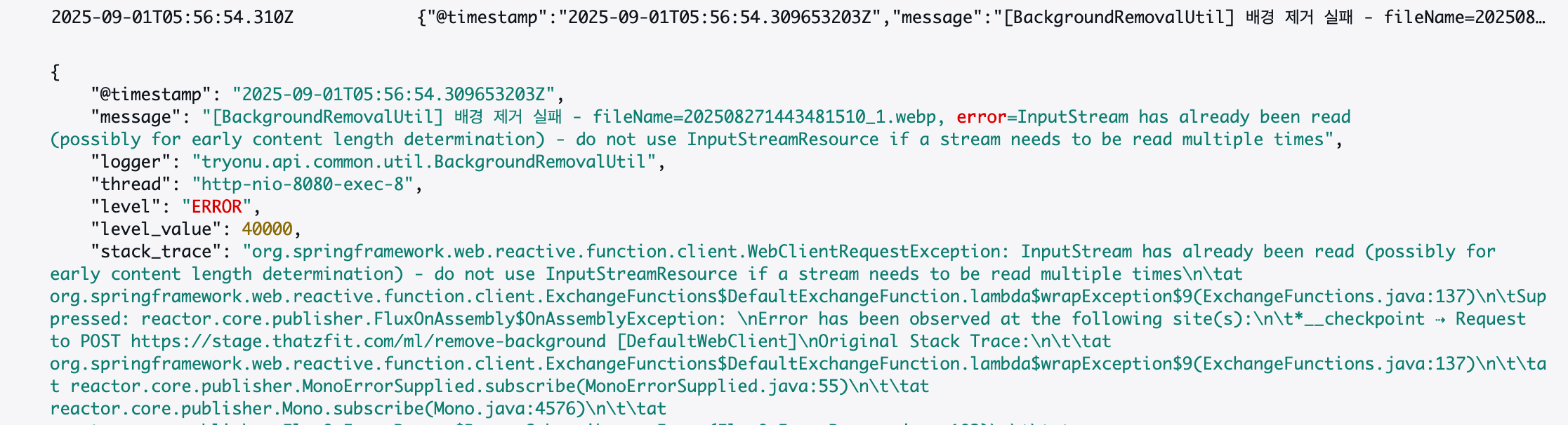 WebClient는 외부 API로 파일을 전송하기 위해 다시 한번InputStream을 읽으려고 시도합니다. 하지만 스트림은 이미 캐싱 필터에 의해 소모된 상태이므로,IllegalStateException이 발생하게 된 것입니다.