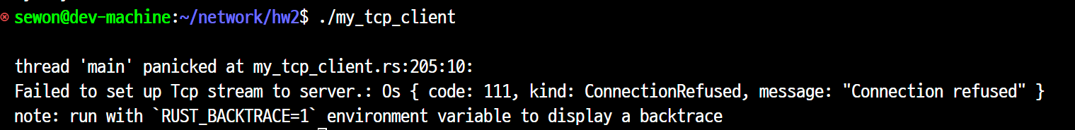 UDP 클라이언트와 서버, TCP 클라이언트와 서버 각각을 rust로 프로그래밍 하는 것이 과제였는데, UDP 클라이언트는 서버가 실행 중이지 않아도 문제 없이 실행 됐었는데 TCP 클라이언트는 서버가 실행 중이지 않은 상태에서 실행될 경우 위와 같은 에러 메시지를 발생시켰습니다.